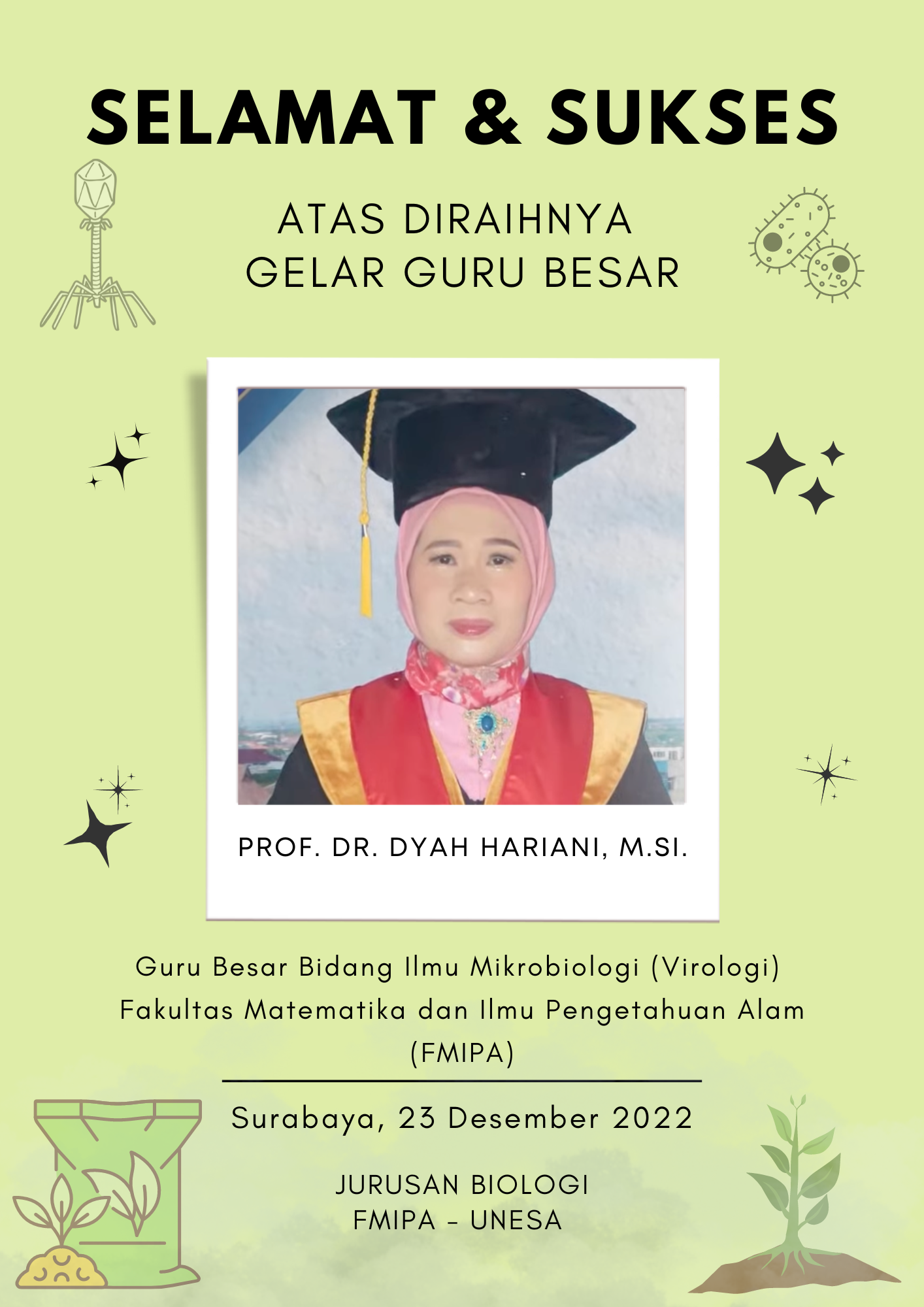 Alhamdulillah, Guru Besar Jurusan Biologi, FMIPA - UNESA bertambah. Pada Rabu, 28 September 2022 telah dikukuhkan gelar Guru Besar kepada Prof. Dr. Ir. Dyah Hariani, M.