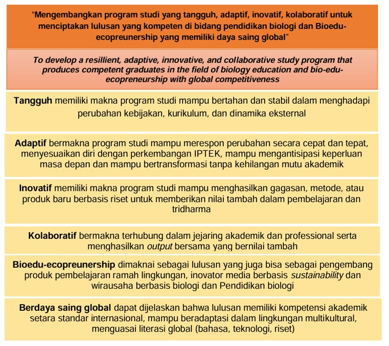Mengembangkan program studi yang tangguh, adaptif, inovatif, kolaboratif untuk menciptakan lulusan yang kompeten di bidang pendidikan biologi dan Bioedu-ecopreunership yang memiliki daya saing global